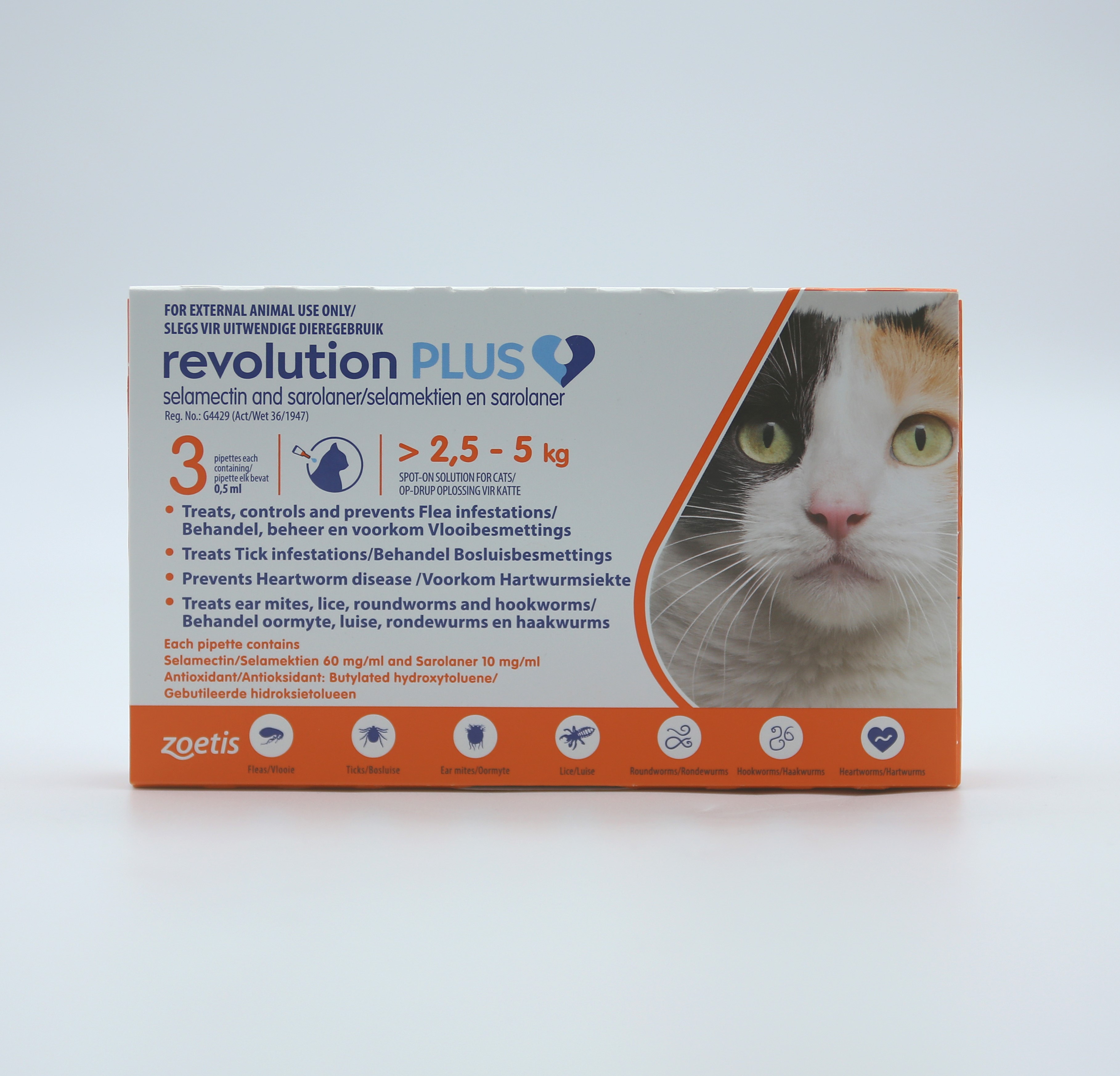 REVOLUTION PLUS should be administered as a single spot-on (topical) application corresponding to a minimum of 6 mg/kg selamectin and 1 mg/kg sarolaner).