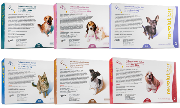 REVOLUTION is an effective broad spectrum endectocide for topical administration to cats and dogs. It contains Selamectin, a semi-synthetic compound of the avermectin class discovered by Pfizer. REVOLUTION is a colourless to pale yellow, ready to use solution available in a 6 % (60 mg/m of Selamectin) solution for puppies, kittens and cats or a 12 % (120 mg/m of Selamectin) solution for dogs. The product is presented in colour-coded, single dose tubes for topical (dermal) treatment in animals not less than six weeks of age. The content of each tube is formulated to provide a minimum of 6 mg Selamectin/kg body mass. The compound can be used in avermectin-sensitive collie dogs and kills a wide range of invertebrate parasites. As a member of the ivermectin class it paralyses and/or kills a wide range of invertebrate parasites through interference with their chloride channel conductance causing disruption of normal neurotransmission. This inhibits electrical activity of nerve/muscle cells in nematodes and arthropods leading to their paralysis and death.